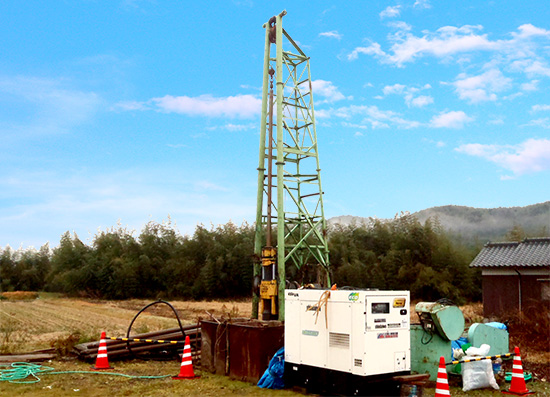 ボーリングマシン使用にて家庭用~工業用~大深度用に対応できる体制をとっております。更に当社独自工法により、地上部からの汚染を防ぎ又永きにわたり良好な地下水を護れるよう日々努力しております。実務では公的資格者として一級さく井技能士が工事を担っております。